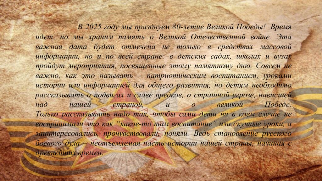 В 2025 году мы празднуем 80-летие Великой Победы! Время идет, но мы храним память о Великой Отечественной войне. Эта важная дата будет отмечена не только в средствах массовой информации, но и по всей стране: в детских садах, школах и вузах пройдут мероприятия, посвященные этому памятному дню. Совсем не важно, как это называть – патриотическим воспитанием, уроками истории или информацией для общего развития, но детям необходимо рассказывать о подвигах и славе предков, о страшной угрозе, нависшей над нашей страной, и о великой Победе. Только рассказывать надо так, чтобы сами дети ни в коем случае не воспринимали это как “какое-то там воспитание” или скучные уроки, а заинтересовались, прочувствовали, поняли. Ведь становление русского боевого духа – неотъемлемая часть истории нашей страны, начиная с древнейших времен.