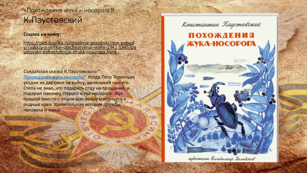 Ссылка на книгу: https://ped-kopilka.ru/shkolnye-prazdniki/den-pobedy/raskazy-o-velikoi-otechestvenoi-voine-1941-1945/paustovskii-pohozhdenija-zhuka-nosoroga.html Солдатская сказка К.Паустовского “ Похождения жука-носорога “. Когда Петр Терентьев уходил из деревни на войну, маленький сын его Степа не знал, что подарить отцу на прощание, и подарил наконец старого жука-носорога. Жук прошел вместе с отцом всю войну и вернулся в родные края. Удивительная история дружбы человека и жука!