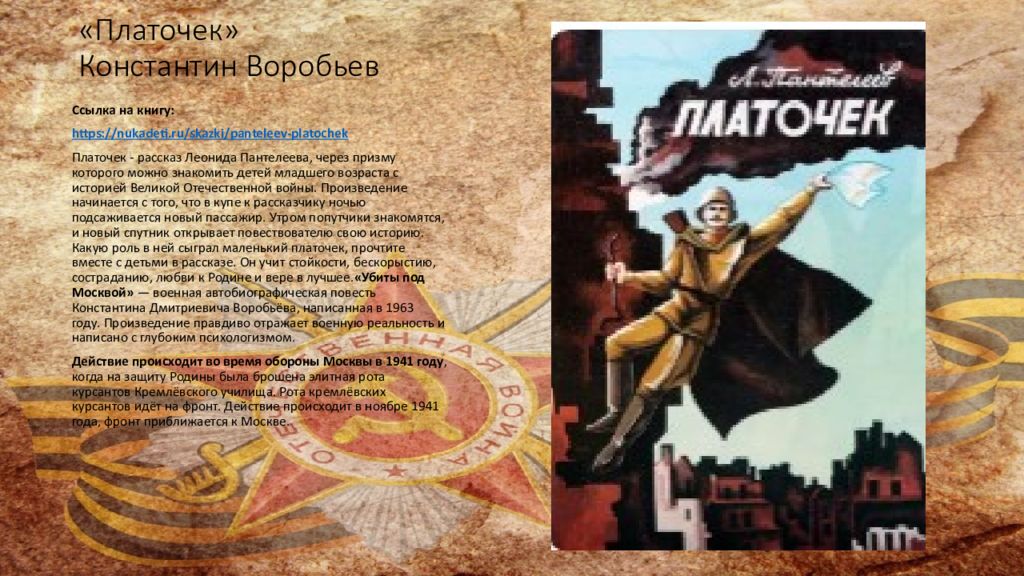Ссылка на книгу: https://nukadeti.ru/skazki/panteleev-platochek Платочек - рассказ Леонида Пантелеева, через призму которого можно знакомить детей младшего возраста с историей Великой Отечественной войны. Произведение начинается с того, что в купе к рассказчику ночью подсаживается новый пассажир. Утром попутчики знакомятся, и новый спутник открывает повествователю свою историю. Какую роль в ней сыграл маленький платочек, прочтите вместе с детьми в рассказе. Он учит стойкости, бескорыстию, состраданию, любви к Родине и вере в лучшее. « Убиты под Москвой» — военная автобиографическая повесть Константина Дмитриевича Воробьёва, написанная в 1963 году. Произведение правдиво отражает военную реальность и написано с глубоким психологизмом. Действие происходит во время обороны Москвы в 1941 году, когда на защиту Родины была брошена элитная рота курсантов Кремлёвского училища. Рота кремлёвских курсантов идёт на фронт. Действие происходит в ноябре 1941 года, фронт приближается к Москве.