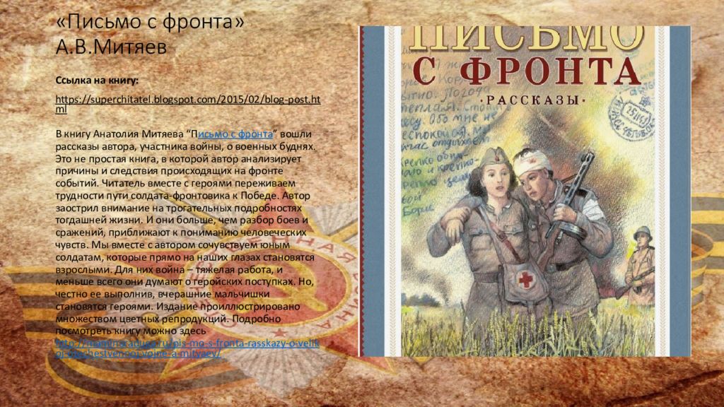 Ссылка на книгу: https://superchitatel.blogspot.com/2015/02/blog-post.html В книгу Анатолия Митяева “П исьмо с фронта ” вошли рассказы автора, участника войны, о военных буднях. Это не простая книга, в которой автор анализирует причины и следствия происходящих на фронте событий. Читатель вместе с героями переживаем трудности пути солдата-фронтовика к Победе. Автор заострил внимание на трогательных подробностях тогдашней жизни. И они больше, чем разбор боев и сражений, приближают к пониманию человеческих чувств. Мы вместе с автором сочувствуем юным солдатам, которые прямо на наших глазах становятся взрослыми. Для них война – тяжелая работа, и меньше всего они думают о геройских поступках. Но, честно ее выполнив, вчерашние мальчишки становятся героями. Издание проиллюстрировано множеством цветных репродукций. Подробно посмотреть книгу можно здесь http://maminaraduga.ru/pis-mo-s-fronta-rasskazy-o-velikoj-otechestvennoj-vojne-a-mityaev/