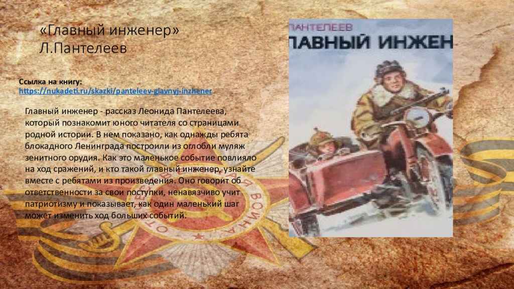 Ссылка на книгу: https://nukadeti.ru/skazki/panteleev-glavnyj-inzhener Главный инженер - рассказ Леонида Пантелеева, который познакомит юного читателя со страницами родной истории. В нем показано, как однажды ребята блокадного Ленинграда построили из оглобли муляж зенитного орудия. Как это маленькое событие повлияло на ход сражений, и кто такой главный инженер, узнайте вместе с ребятами из произведения. Оно говорит об ответственности за свои поступки, ненавязчиво учит патриотизму и показывает, как один маленький шаг может изменить ход больших событий.