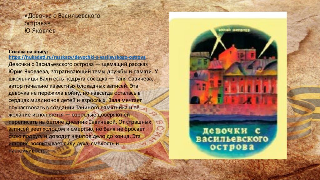 Ссылка на книгу: https://nukadeti.ru/rasskazy/devochki-s-vasilevskogo-ostrova Девочки с Васильевского острова — щемящий рассказ Юрия Яковлева, затрагивающий темы дружбы и памяти. У школьницы Вали есть подруга-соседка — Таня Савичева, автор печально известных блокадных записей. Эта девочка не пережила войну, но навсегда осталась в сердцах миллионов детей и взрослых. Валя мечтает поучаствовать в создании Таниного памятника и её желание исполняется — взрослые доверяют ей переписать на бетоне дневник Савичевой. От страшных записей веет холодом и смертью, но Валя не бросает свою подругу и доводит начатое дело до конца. Эта история воспитывает силу духа, смелость и настойчивость.