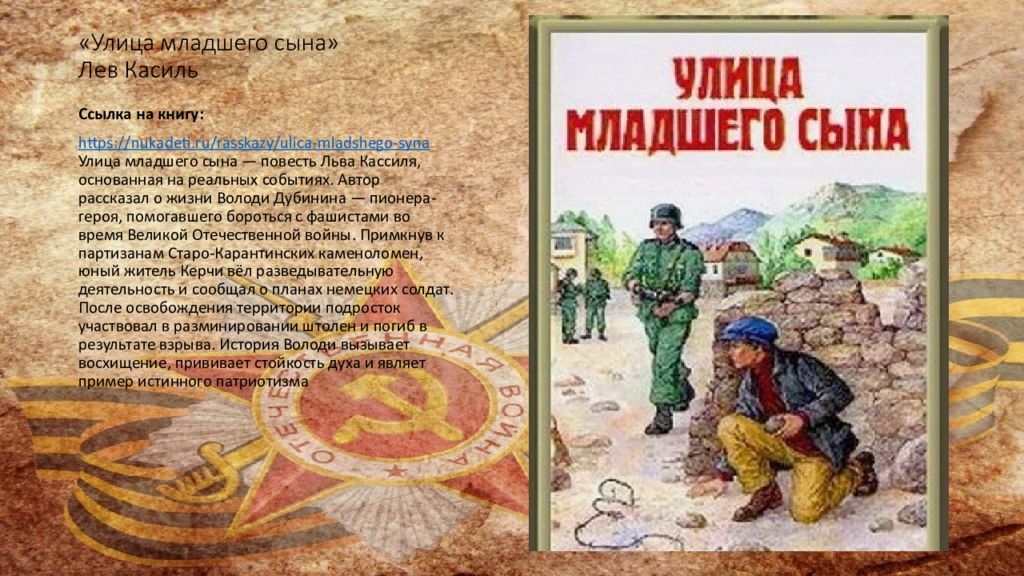 Ссылка на книгу: https://nukadeti.ru/rasskazy/ulica-mladshego-syna Улица младшего сына — повесть Льва Кассиля, основанная на реальных событиях. Автор рассказал о жизни Володи Дубинина — пионера-героя, помогавшего бороться с фашистами во время Великой Отечественной войны. Примкнув к партизанам Старо-Карантинских каменоломен, юный житель Керчи вёл разведывательную деятельность и сообщал о планах немецких солдат. После освобождения территории подросток участвовал в разминировании штолен и погиб в результате взрыва. История Володи вызывает восхищение, прививает стойкость духа и являет пример истинного патриотизма
