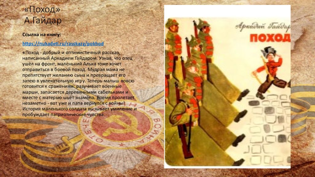 Ссылка на книгу: https://nukadeti.ru/rasskazy/pokhod « Поход - добрый и оптимистичный рассказ, написанный Аркадием Гайдаром. Узнав, что отец ушёл на фронт, маленький Алька тоже хочет отправиться в боевой поход. Мудрая мама не препятствует желанию сына и превращает его затею в увлекательную игру. Теперь малыш вовсю готовится к сражениям: разучивает военные марши, запасается деревянными сабельками и вместе с матерью шьёт знамёна. Время пролетает незаметно - вот уже и папа вернулся с войны! История маленького солдата вызывает умиление и пробуждает патриотические чувства.
