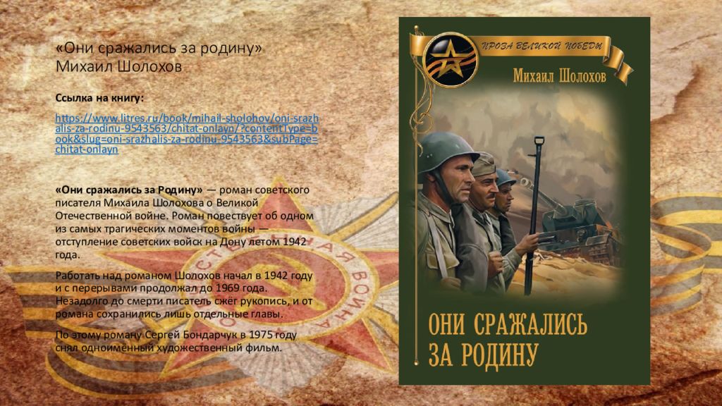 Ссылка на книгу: https://www.litres.ru/book/mihail-sholohov/oni-srazhalis-za-rodinu-9543563/chitat-onlayn/?contentType=book&slug=oni-srazhalis-za-rodinu-9543563&subPage=chitat-onlayn «Они сражались за Родину» — роман советского писателя Михаила Шолохова о Великой Отечественной войне. Роман повествует об одном из самых трагических моментов войны — отступление советских войск на Дону летом 1942 года. Работать над романом Шолохов начал в 1942 году и с перерывами продолжал до 1969 года. Незадолго до смерти писатель сжёг рукопись, и от романа сохранились лишь отдельные главы. По этому роману Сергей Бондарчук в 1975 году снял одноимённый художественный фильм.