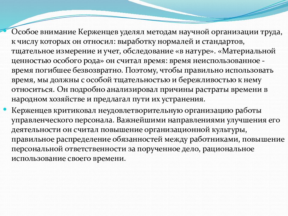 Особое внимание Керженцев уделял методам научной организации труда, к числу которых он относил: выработку нормалей и стандартов, тщательное измерение и учет, обследование «в натуре». «Материальной ценностью особого рода» он считал время: время неиспользованное - время погибшее безвозвратно. Поэтому, чтобы правильно использовать время, мы должны с особой тщательностью и бережливостью к нему относиться. Он подробно анализировал причины растраты времени в народном хозяйстве и предлагал пути их устранения. Керженцев критиковал неудовлетворительную организацию работы управленческого персонала. Важнейшими направлениями улучшения его деятельности он считал повышение организационной культуры, правильное распределение обязанностей между работниками, повышение персональной ответственности за порученное дело, рациональное использование своего времени.