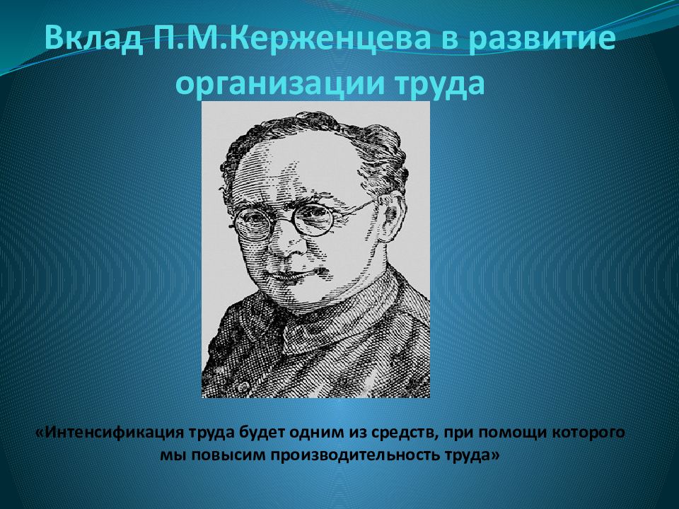 Последний слайд презентации: Вклад П.М.Керженцева в развитие организации труда «Интенсификация труда будет