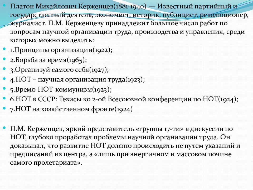 Платон Михайлович Керженцев (1881-1940) — Известный партийный и государственный деятель, экономист, историк, публицист, революционер, журналист. П.М. Керженцеву принадлежит большое число работ по вопросам научной организации труда, производства и управления, среди которых можно выделить: 1.Принципы организации(19 22 ); 2.Борьба за время(1965); 3.Организуй самого себя(1927); 4.НОТ – научная организация труда(1923); 5.Время-НОТ-коммунизм(1923); 6.НОТ в СССР: Тезисы ко 2-ой Всесоюзной конференции по НОТ(1924); 7.НОТ на хозяйственном фронте(1924) П.М. Керженцев, яркий представитель «группы 17-ти» в дискуссии по НОТ, глубоко проработал проблемы научной организации труда. Он доказывал, что развитие НОТ должно происходить не путем указаний и предписаний из центра, а «лишь при энергичном и массовом почине самого пролетариата».