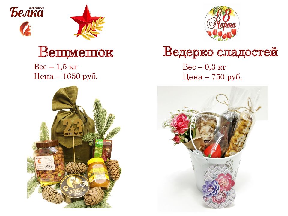 Вещмешок Вес – 1,5 кг Цена – 1650 руб. Ведерко сладостей Вес – 0,3 кг Цена – 7 50 руб.