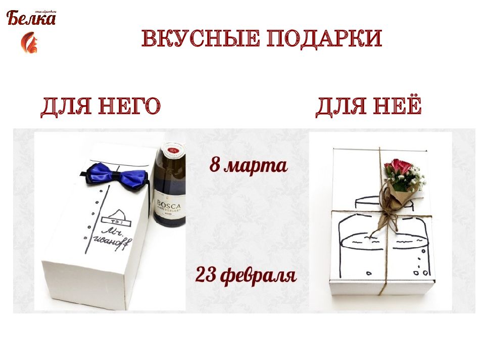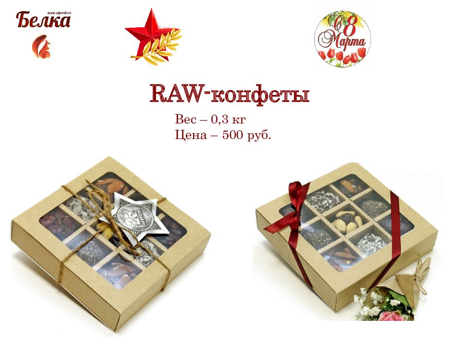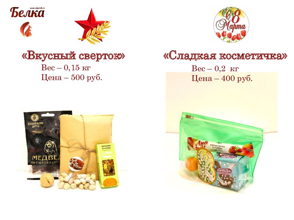«Вкусный сверток» Вес – 0,15 кг Цена – 500 руб. «Сладкая косметичка» Вес – 0,2 кг Цена – 400 руб.