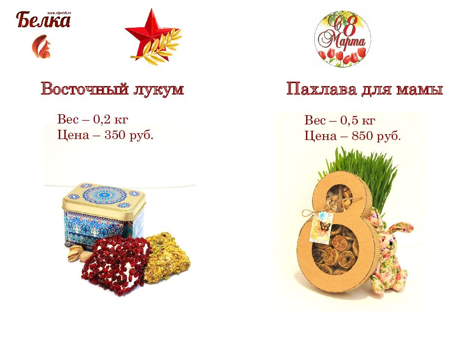 Восточный лукум Пахлава для мамы Вес – 0,2 кг Цена – 350 руб. Вес – 0,5 кг Цена – 850 руб.