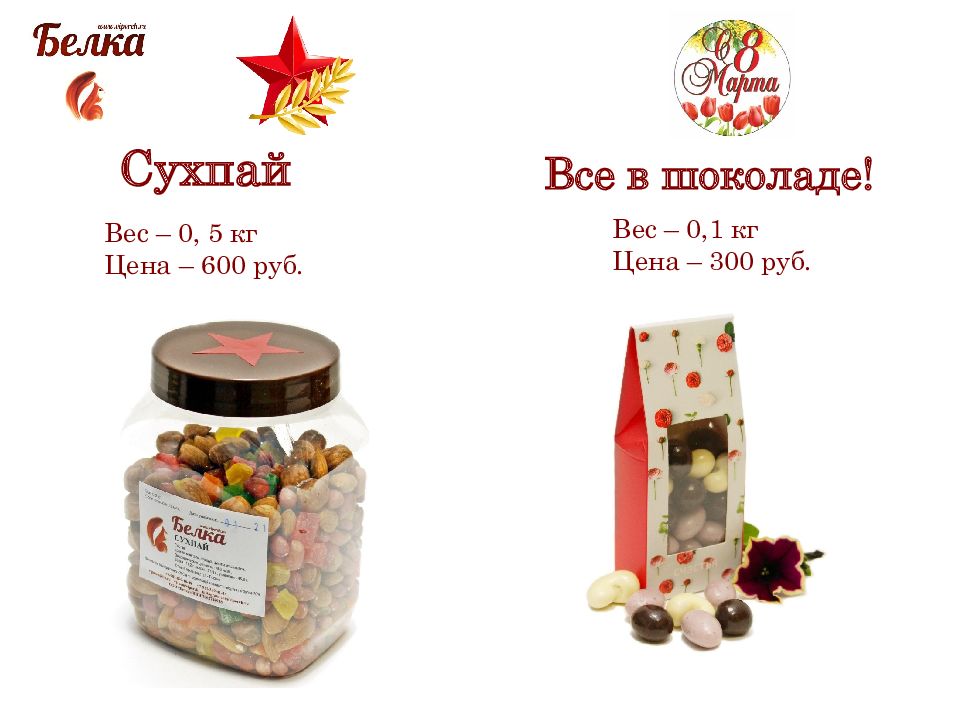 Сухпай Вес – 0, 5 кг Цена – 600 руб. Все в шоколаде! Вес – 0,1 кг Цена – 300 руб.