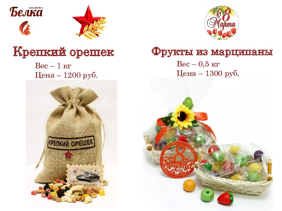 Крепкий орешек Вес – 1 кг Цена – 1200 руб. Фрукты из марципаны Вес – 0,5 кг Цена – 1 300 руб.