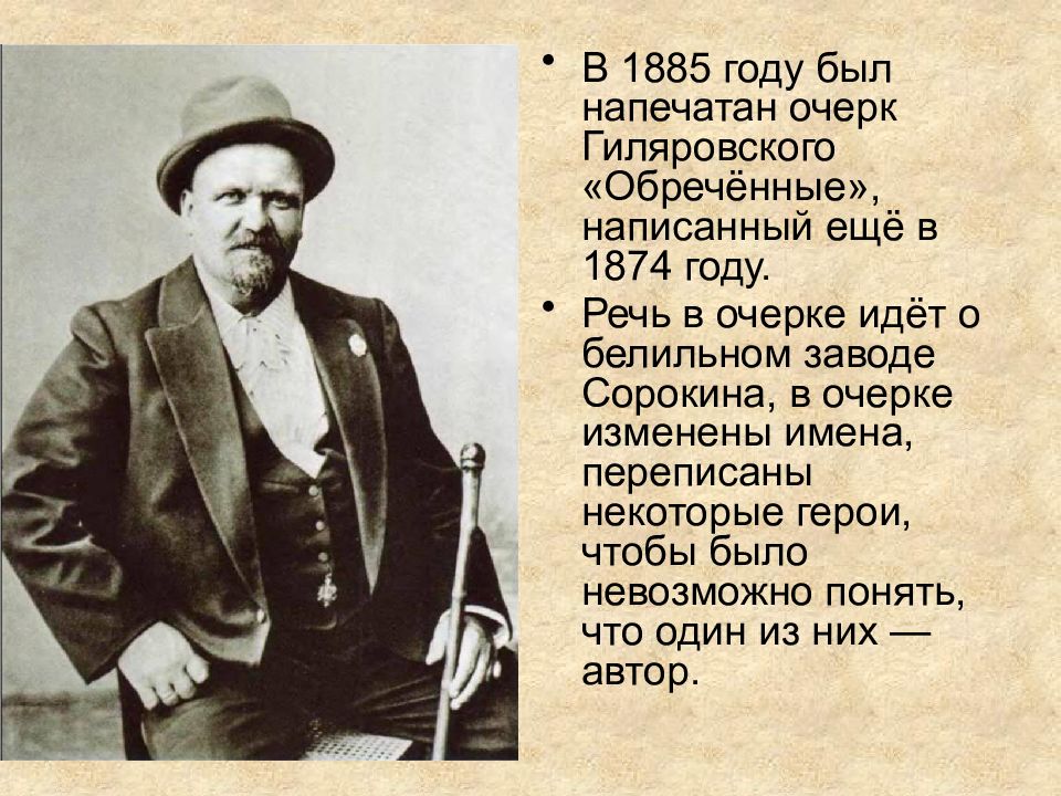 В 1885 году был напечатан очерк Гиляровского «Обречённые», написанный ещё в 1874 году. Речь в очерке идёт о белильном заводе Сорокина, в очерке изменены имена, переписаны некоторые герои, чтобы было невозможно понять, что один из них — автор.