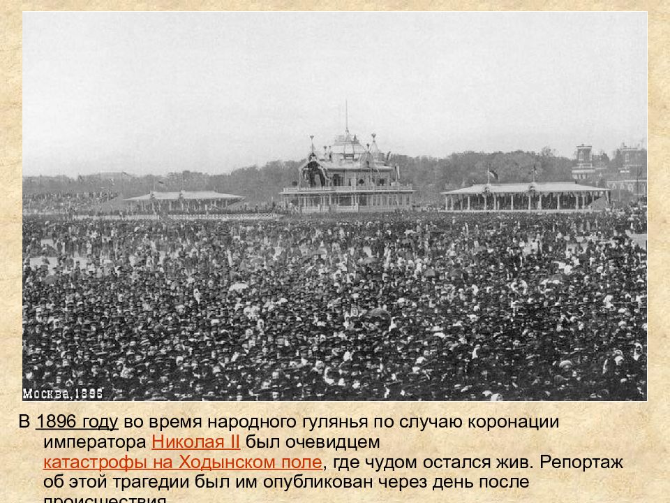 В 1896 году во время народного гулянья по случаю коронации императора Николая II был очевидцем катастрофы на Ходынском поле, где чудом остался жив. Репортаж об этой трагедии был им опубликован через день после происшествия.