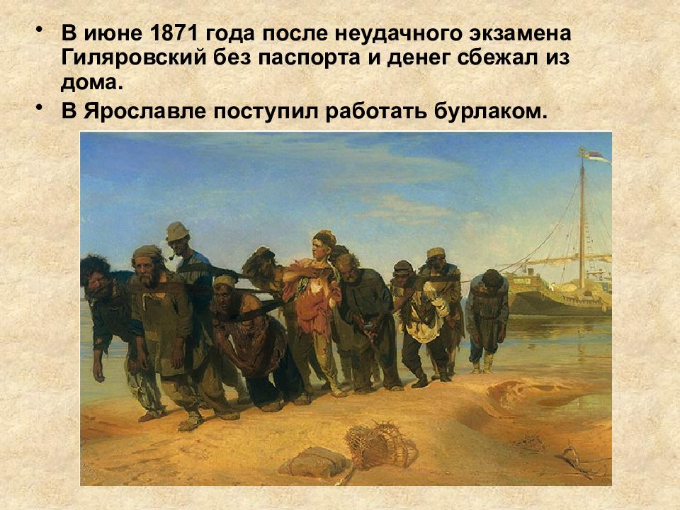 В июне 1871 года после неудачного экзамена Гиляровский без паспорта и денег сбежал из дома. В Ярославле поступил работать бурлаком.