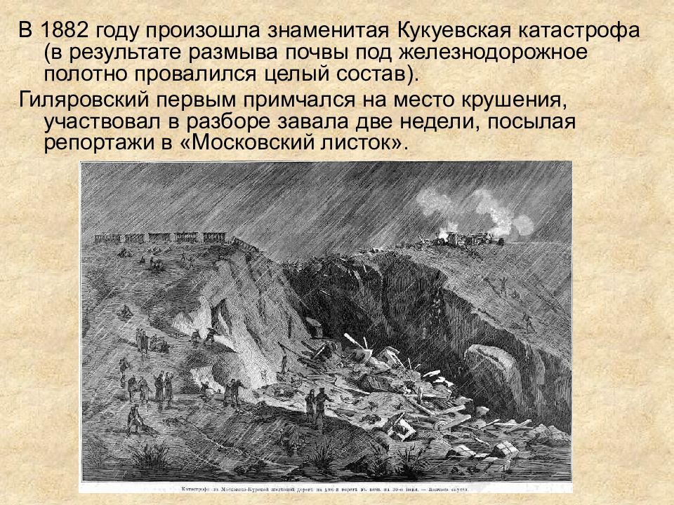 В 1882 году произошла знаменитая Кукуевская катастрофа (в результате размыва почвы под железнодорожное полотно провалился целый состав). Гиляровский первым примчался на место крушения, участвовал в разборе завала две недели, посылая репортажи в «Московский листок».
