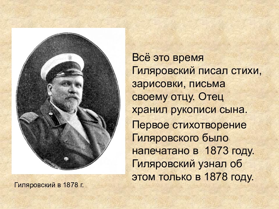 Всё это время Гиляровский писал стихи, зарисовки, письма своему отцу. Отец хранил рукописи сына. Первое стихотворение Гиляровского было напечатано в 1873 году. Гиляровский узнал об этом только в 1878 году. Гиляровский в 1878 г.