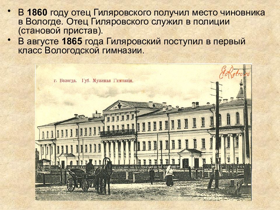 В 1860 году отец Гиляровского получил место чиновника в Вологде. Отец Гиляровского служил в полиции (становой пристав). В августе 1865 года Гиляровский поступил в первый класс Вологодской гимназии.
