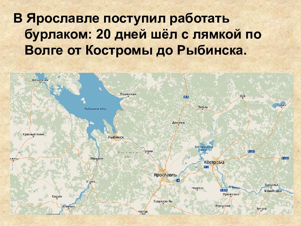В Ярославле поступил работать бурлаком: 20 дней шёл с лямкой по Волге от Костромы до Рыбинска.