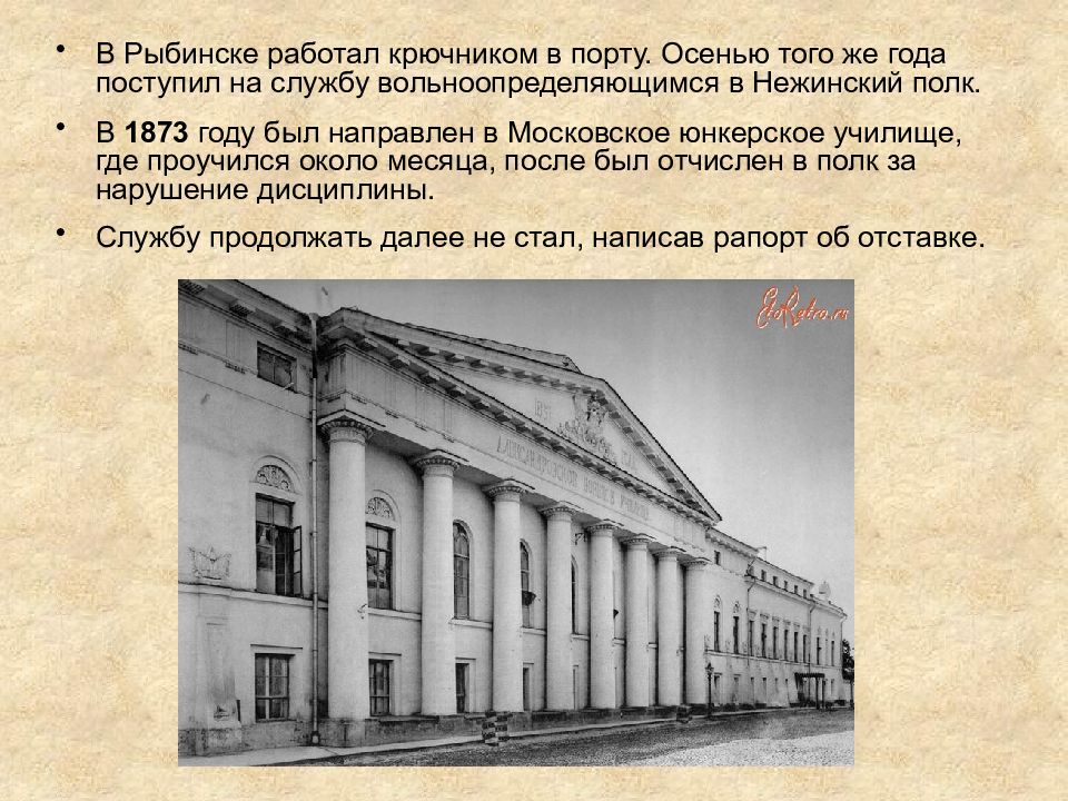 В Рыбинске работал крючником в порту. Осенью того же года поступил на службу вольноопределяющимся в Нежинский полк. В 1873 году был направлен в Московское юнкерское училище, где проучился около месяца, после был отчислен в полк за нарушение дисциплины. Службу продолжать далее не стал, написав рапорт об отставке.