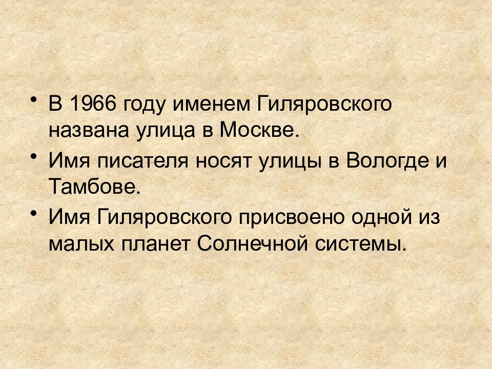 В 1966 году именем Гиляровского названа улица в Москве. Имя писателя носят улицы в Вологде и Тамбове. Имя Гиляровского присвоено одной из малых планет Солнечной системы.