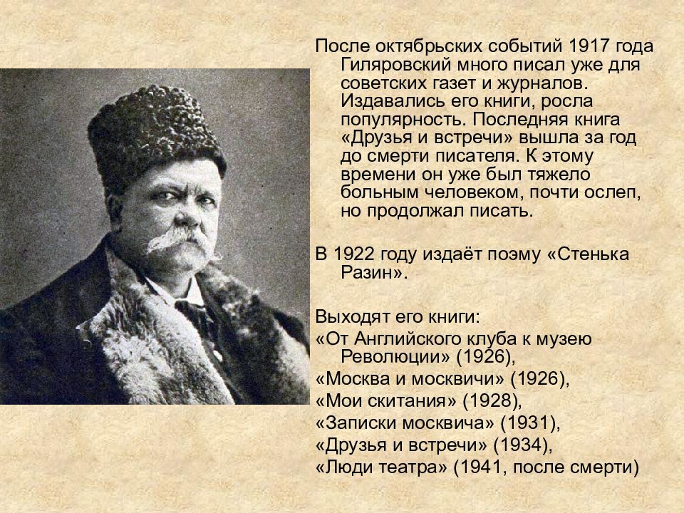 После октябрьских событий 1917 года Гиляровский много писал уже для советских газет и журналов. Издавались его книги, росла популярность. Последняя книга «Друзья и встречи» вышла за год до смерти писателя. К этому времени он уже был тяжело больным человеком, почти ослеп, но продолжал писать. В 1922 году издаёт поэму «Стенька Разин». Выходят его книги: «От Английского клуба к музею Революции» (1926), «Москва и москвичи» (1926), «Мои скитания» (1928), «Записки москвича» (1931), «Друзья и встречи» (1934), «Люди театра» (1941, после смерти)