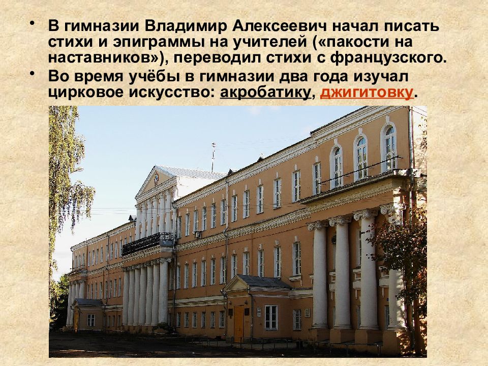 В гимназии Владимир Алексеевич начал писать стихи и эпиграммы на учителей («пакости на наставников»), переводил стихи с французского. Во время учёбы в гимназии два года изучал цирковое искусство: акробатику, джигитовку.