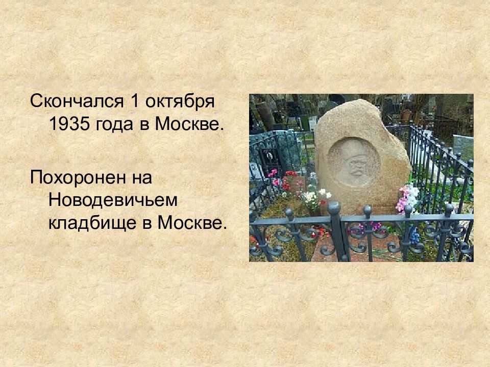 Скончался 1 октября 1935 года в Москве. Похоронен на Новодевичьем кладбище в Москве.