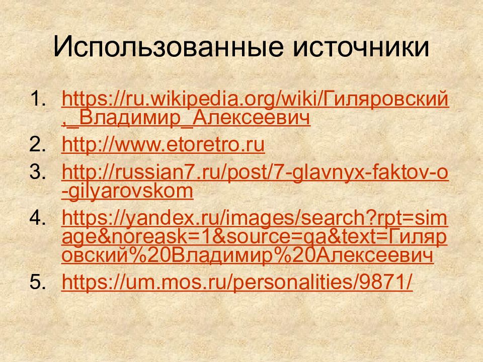 Последний слайд презентации: Владимир Алексеевич Гиляровский: Использованные источники