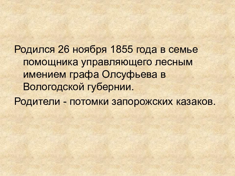 Родился 26 ноября 1855 года в семье помощника управляющего лесным имением графа Олсуфьева в Вологодской губернии. Родители - потомки запорожских казаков.