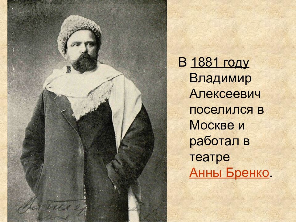 В 1881 году Владимир Алексеевич поселился в Москве и работал в театре Анны Бренко.