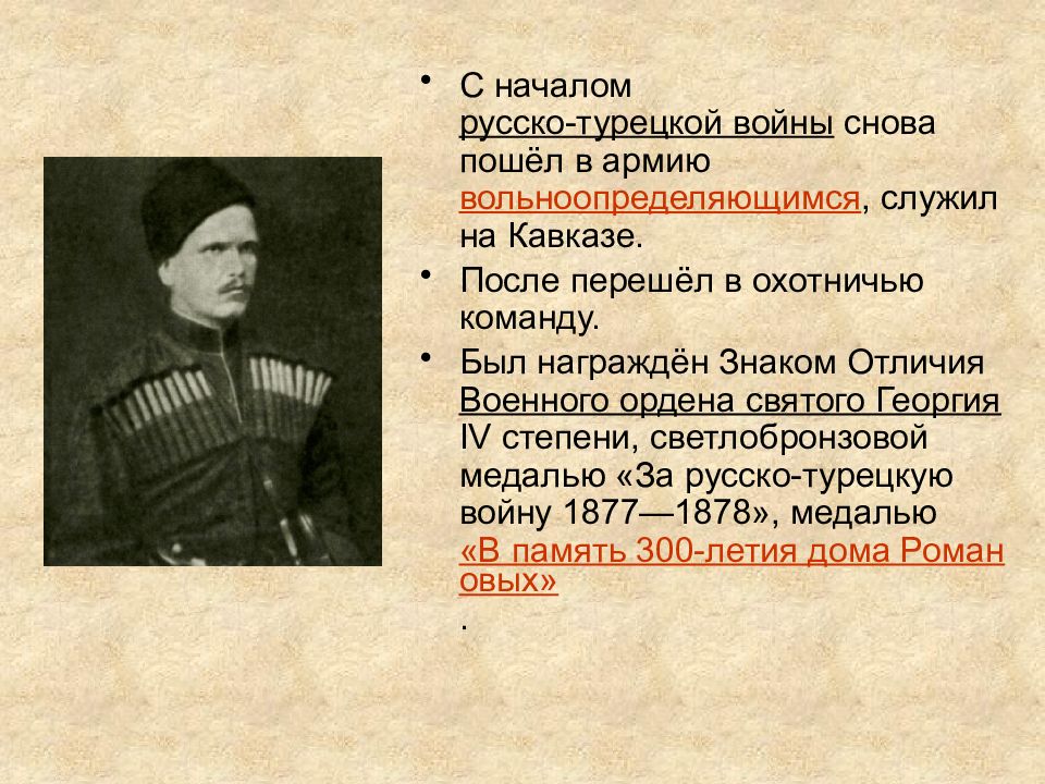 С началом русско-турецкой войны снова пошёл в армию вольноопределяющимся, служил на Кавказе. После перешёл в охотничью команду. Был награждён Знаком Отличия Военного ордена святого Георгия IV степени, светлобронзовой медалью «За русско-турецкую войну 1877—1878», медалью «В память 300-летия дома Романовых».