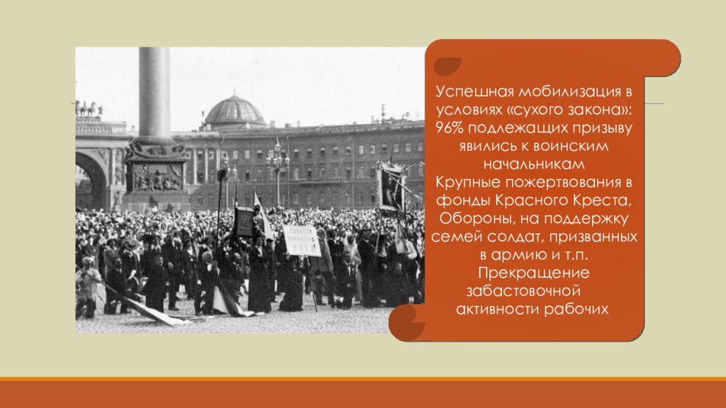 Успешная мобилизация в условиях «сухого закона»: 96 % подлежащих призыву явились к воинским начальникам Крупные пожертвования в фонды Красного Креста, Обороны, на поддержку семей солдат, призванных в армию и т.п. Прекращение забастовочной активности рабочих