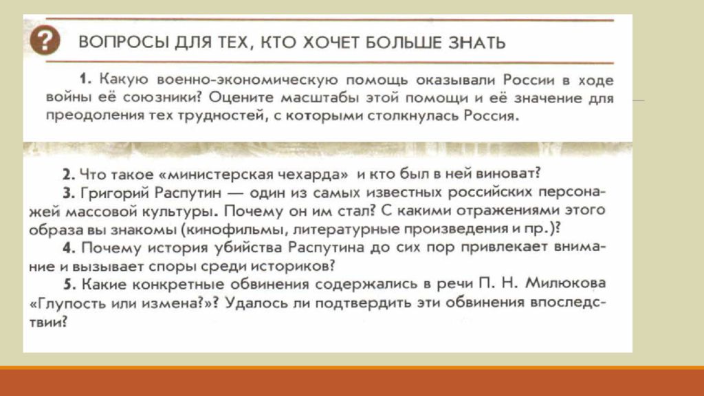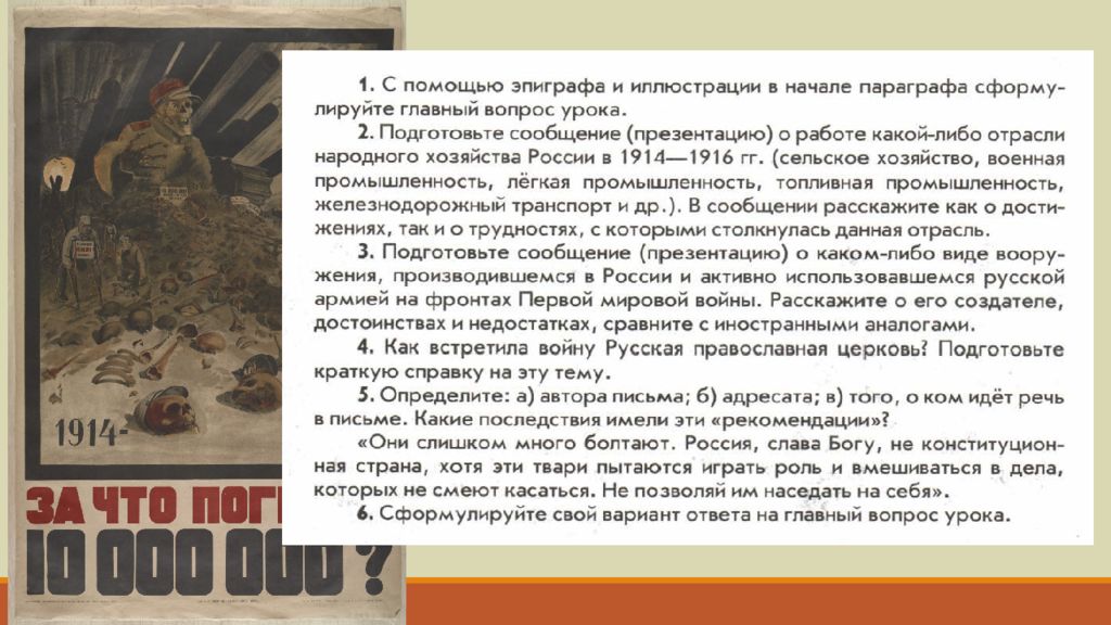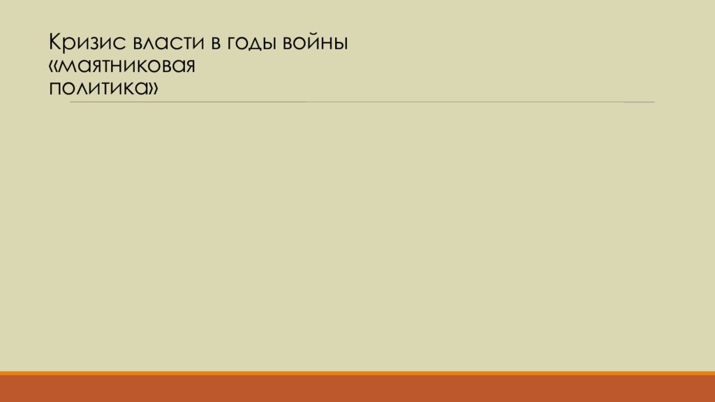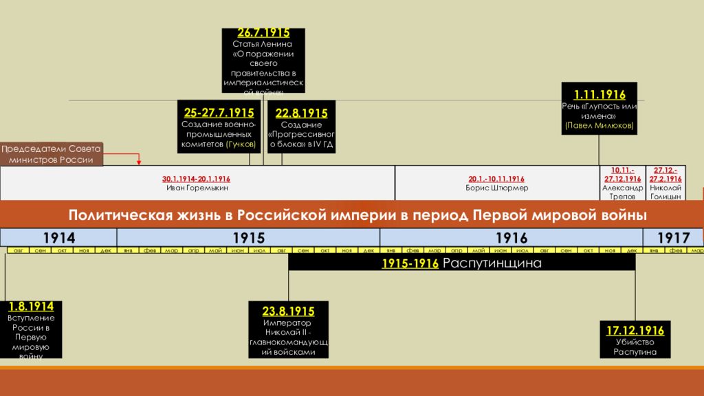 авг сен окт ноя дек янв фев мар апр май июн июл авг сен окт ноя дек янв фев мар апр май июн июл авг сен окт ноя дек янв фев мар 1914 1915 1916 1917 22.8.1915 Создание «Прогрессивного блока» в IV ГД 26.7.1915 Статья Ленина « О поражении своего правительства в империалистической войне» 23.8.1915 Император Николай II - главнокомандующий войсками 1.8.1914 Вступление России в Первую мировую войну 1915-1916 Распутинщина 17.12.1916 Убийство Распутина 30.1.1914-20.1.1916 Иван Горемыкин 20.1.- 10.11.1916 Борис Штюрмер 10.11.-27.12.1916 Александр Трепов 27.12.-27.2.1916 Николай Голицын 1.11.1916 Речь «Глупость или измена» (Павел Милюков) Политическая жизнь в Российской империи в период Первой мировой войны 25-27.7.1915 Создание военно-промышленных комитетов (Гучков) Председатели Совета министров России