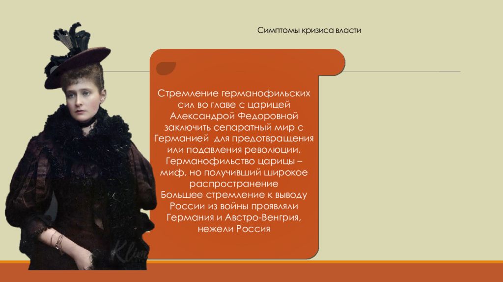 Стремление германофильских сил во главе с царицей Александрой Федоровной заключить сепаратный мир с Германией для предотвращения или подавления революции. Германофильство царицы – миф, но получивший широкое распространение Большее стремление к выводу России из войны проявляли Германия и Австро-Венгрия, нежели Россия