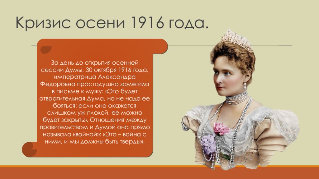 За день до открытия осенней сессии Думы, 30 октября 1916 года, императрица Александра Федоровна простодушно заметила в письме к мужу: «Это будет отвратительная Дума, но не надо ее бояться: если она окажется слишком уж плохой, ее можно будет закрыть». Отношения между правительством и Думой она прямо называла «войной»: «Это – война с ними, и мы должны быть тверды».