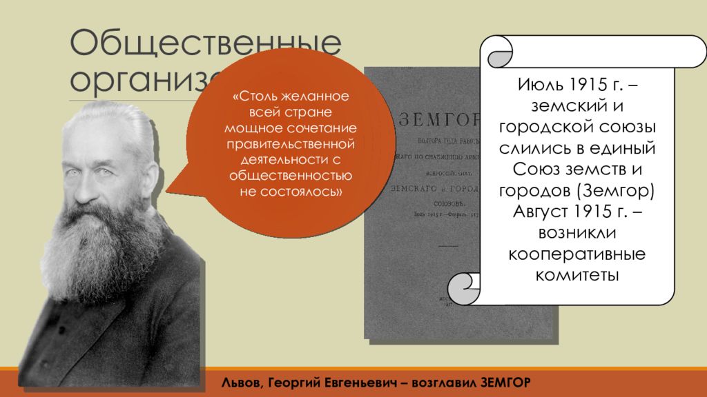 Июль 1915 г. – земский и городской союзы слились в единый Союз земств и городов (Земгор ) Август 1915 г. – возникли кооперативные комитеты Львов, Георгий Евгеньевич – возглавил ЗЕМГОР « Столь желанное всей стране мощное сочетание правительственной деятельности с общественностью не состоялось»