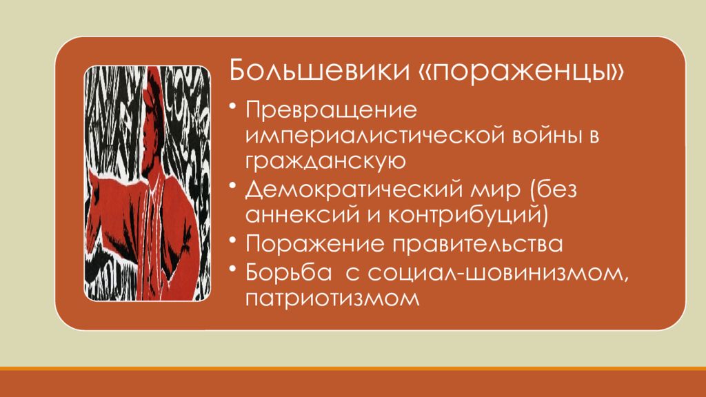 1.Поддержка правительства 2.Временный отказ от революционной борьбы 1.Продолжение борьбы 2.Поражение правительства ускорит победу революции 1.Противопоставить империалистам Интернациональную солидарность трудящихся 2.Демократический мир Демократический мир (без аннексий и контрибуций) цивилизованными методами