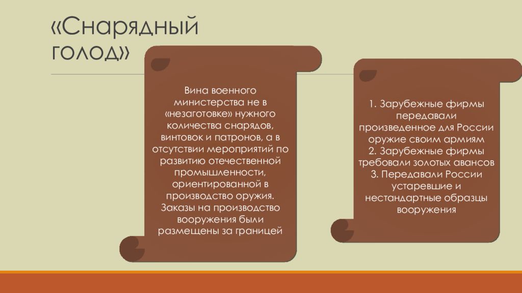 Вина военного министерства не в «незаготовке» нужного количества снарядов, винтовок и патронов, а в отсутствии мероприятий по развитию отечественной промышленности, ориентированной в производство оружия. Заказы на производство вооружения были размещены за границей 1. Зарубежные фирмы передавали произведенное для России оружие своим армиям 2. Зарубежные фирмы требовали золотых авансов 3. Передавали России устаревшие и нестандартные образцы вооружения