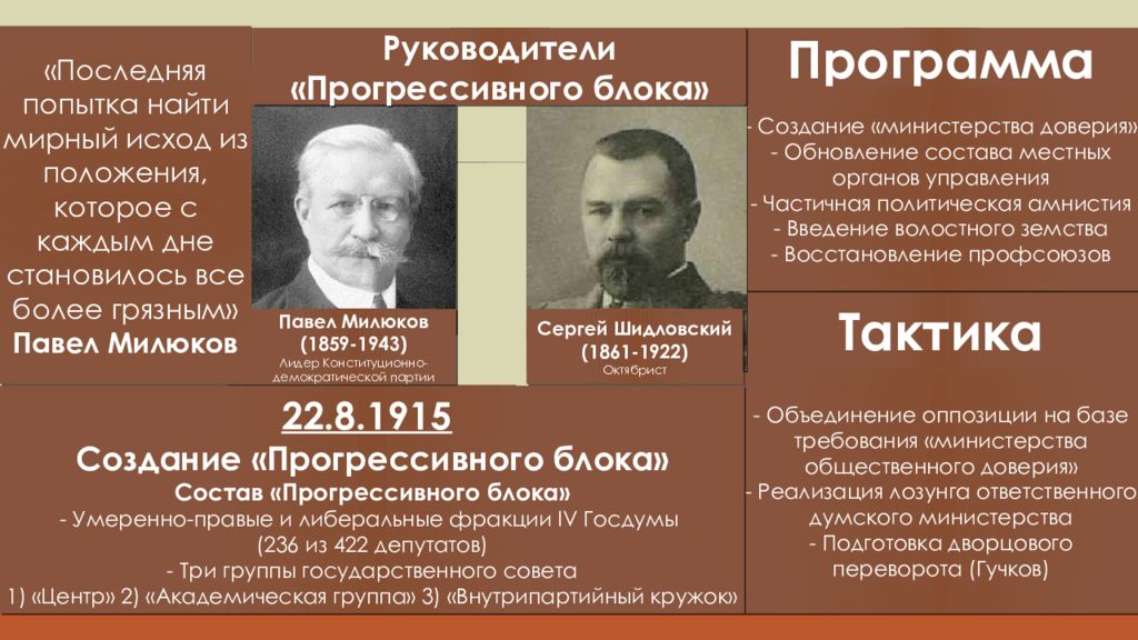 Программа Тактика - Создание «министерства доверия» - Обновление состава местных органов управления - Частичная политическая амнистия - Введение волостного земства - Восстановление профсоюзов - Объединение оппозиции на базе требования «министерства общественного доверия» - Реализация лозунга ответственного думского министерства - Подготовка дворцового переворота (Гучков) 22.8.1915 Создание «Прогрессивного блока» Состав «Прогрессивного блока» - Умеренно-правые и либеральные фракции IV Госдумы (236 из 422 депутатов) - Три группы государственного совета 1) «Центр» 2) «Академическая группа» 3) «Внутрипартийный кружок» «Последняя попытка найти мирный исход из положения, которое с каждым дне становилось все более грязным» Павел Милюков Павел Милюков (1859-1943) Лидер Конституционно-демократической партии Сергей Шидловский (1861-1922) Октябрист Руководители «Прогрессивного блока»
