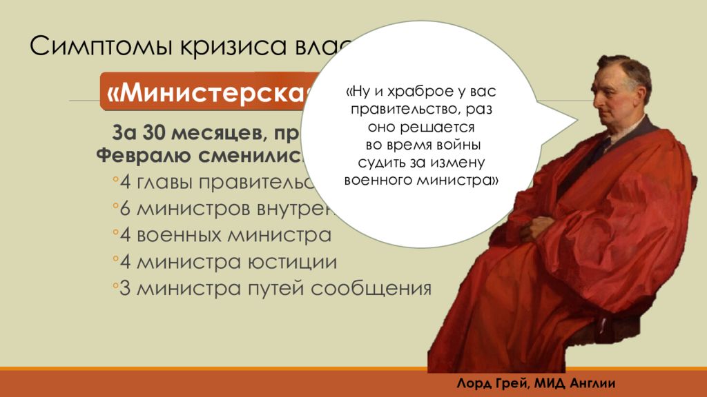 За 30 месяцев, предшествующих Февралю сменились: 4 главы правительства 6 министров внутренних дел 4 военных министра 4 министра юстиции 3 министра путей сообщения «Министерская чехарда» «Ну и храброе у вас правительство, раз оно решается во время войны судить за измену военного министра» Лорд Грей, МИД Англии