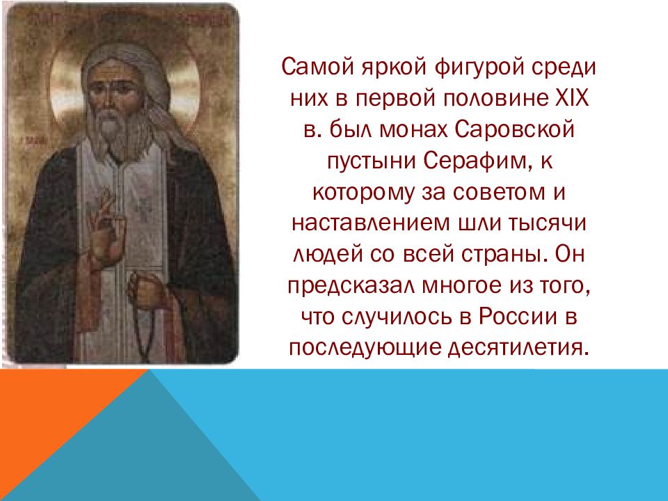 Самой яркой фигурой среди них в первой половине XIX в. был монах Саровской пустыни Серафим, к которому за советом и наставлением шли тысячи людей со всей страны. Он предсказал многое из того, что случилось в России в последующие десятилетия.