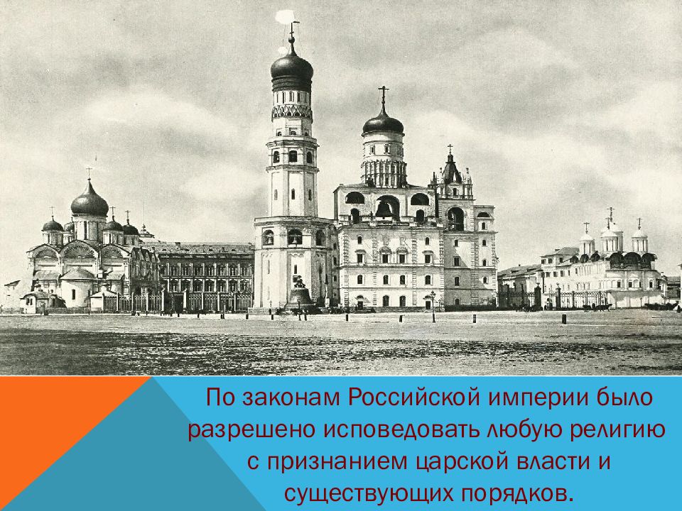 По законам Российской империи было разрешено исповедовать любую религию с признанием царской власти и существующих порядков.