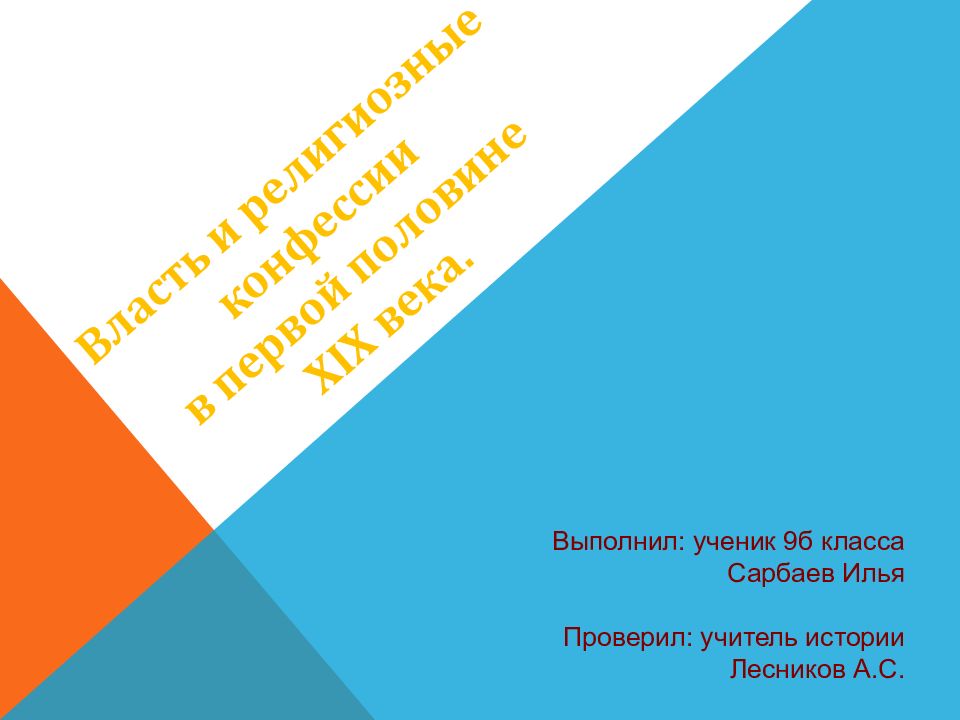Власть и религиозные конфессии в первой половине XIX века. Выполнил: ученик 9б класса Сарбаев Илья Проверил: учитель истории Лесников А.С.