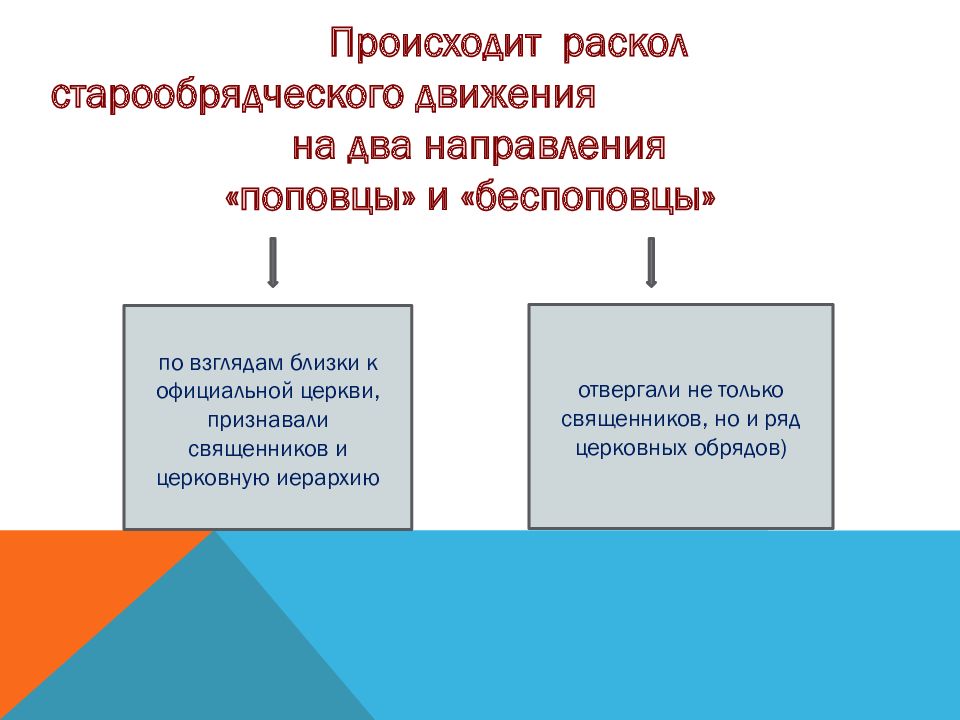 Происходит раскол старообрядческого движения на два направления « поповцы » и «беспоповцы» по взглядам близки к официальной церкви, признавали священников и церковную иерархию отвергали не только священников, но и ряд церковных обрядов)