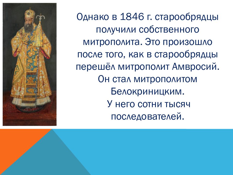 Однако в 1846 г. старообрядцы получили собственного митрополита. Это произошло после того, как в старообрядцы перешёл митрополит Амвросий. Он стал митрополитом Белокриницким. У него сотни тысяч последователей.