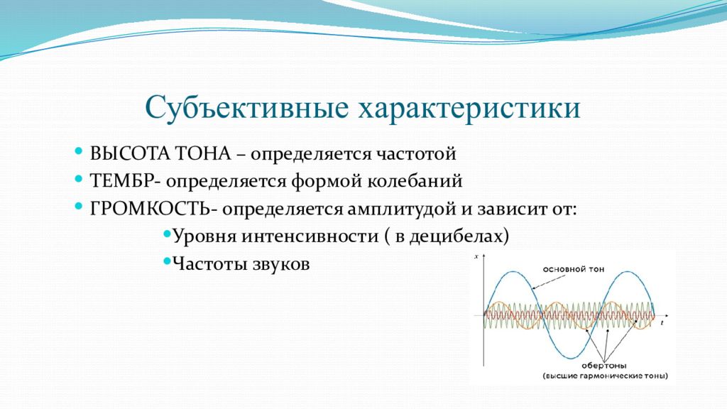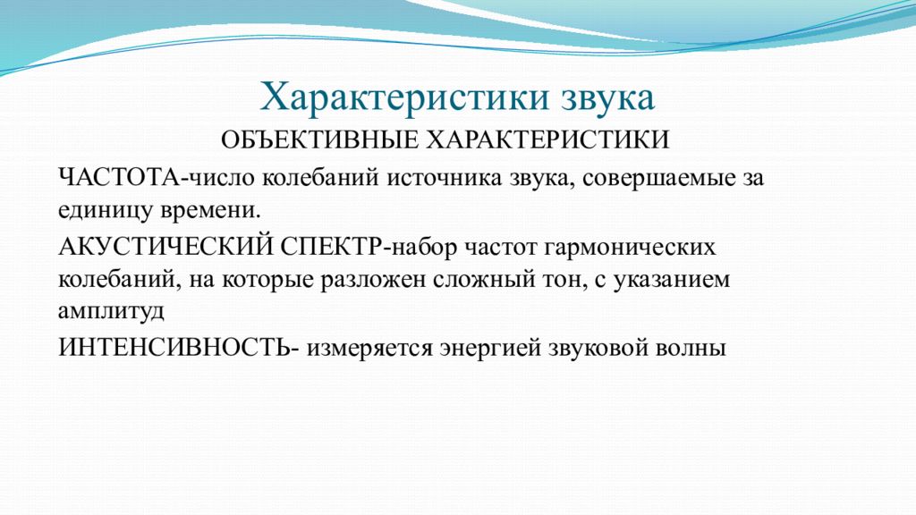 ОБЪЕКТИВНЫЕ ХАРАКТЕРИСТИКИ ЧАСТОТА-число колебаний источника звука, совершаемые за единицу времени. АКУСТИЧЕСКИЙ СПЕКТР-набор частот гармонических колебаний, на которые разложен сложный тон, с указанием амплитуд ИНТЕНСИВНОСТЬ- измеряется энергией звуковой волны