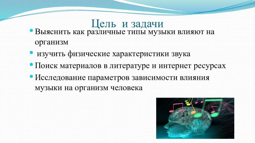 Выяснить как различные типы музыки влияют на организм изучить физические характеристики звука Поиск материалов в литературе и интернет ресурсах Исследование параметров зависимости влияния музыки на организм человека