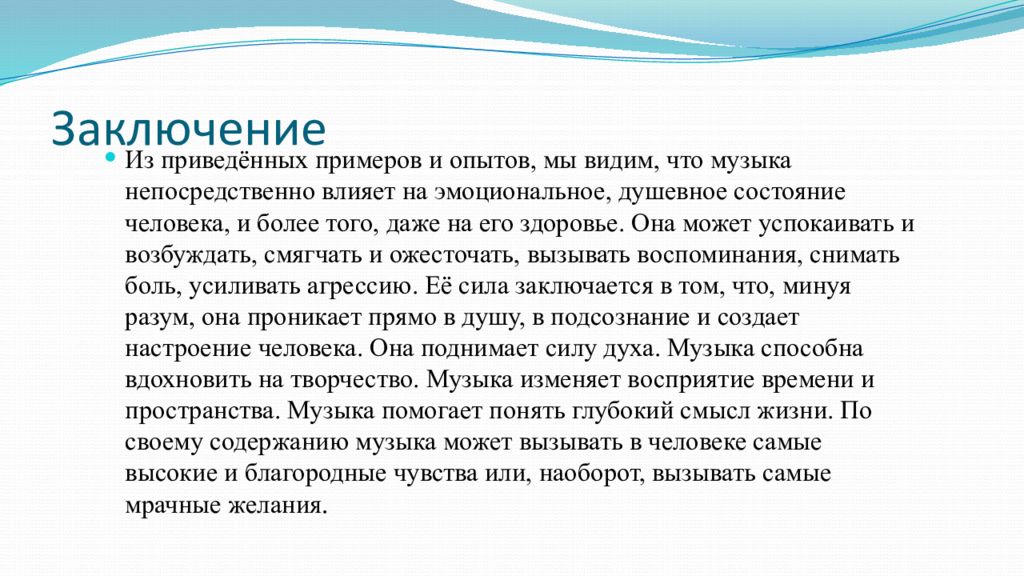 Из приведённых примеров и опытов, мы видим, что музыка непосредственно влияет на эмоциональное, душевное состояние человека, и более того, даже на его здоровье. Она может успокаивать и возбуждать, смягчать и ожесточать, вызывать воспоминания, снимать боль, усиливать агрессию. Её сила заключается в том, что, минуя разум, она проникает прямо в душу, в подсознание и создает настроение человека. Она поднимает силу духа. Музыка способна вдохновить на творчество. Музыка изменяет восприятие времени и пространства. Музыка помогает понять глубокий смысл жизни. По своему содержанию музыка может вызывать в человеке самые высокие и благородные чувства или, наоборот, вызывать самые мрачные желания.